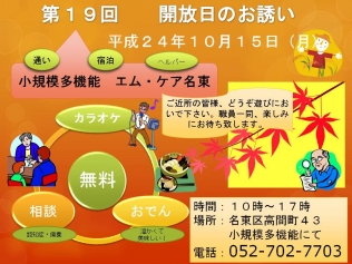 さて、小規模多機能エム・ケア名東、毎月恒例の開放日のお知らせです!